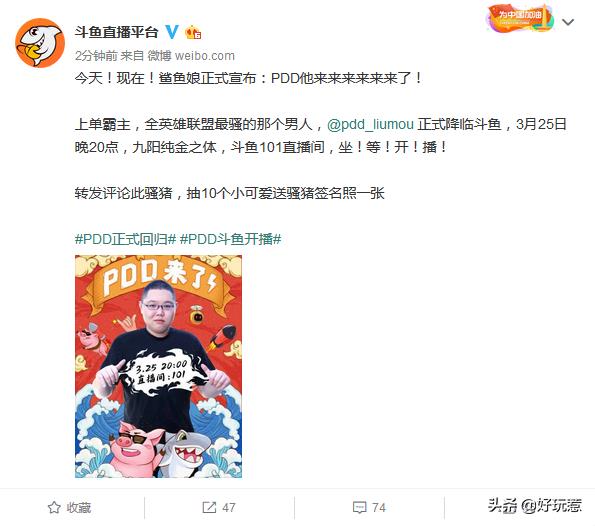 其实在斗鱼官宣之前就已经有多方消息表示PDD将在斗鱼重新开播,在年初的时候PDD与斗鱼多位知名主播有过互动;本月PDD的关门弟子小马、ZZC相继在斗鱼开启直播;3月14号,斗鱼官方透露会签约一名重量级主播;而后斗鱼游戏资讯的官博表示想念PDD!
