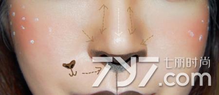 第五步:鼻翼两侧上重修容,鼻梁用白色高光粉一扫而过,用棕色哑光眼线膏在鼻孔周围涂色,并带下一条人中部位的细线。