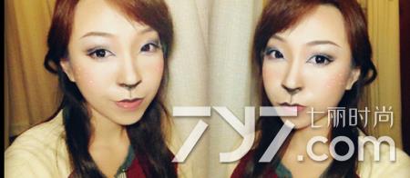 圣诞节必备的麋鹿妆容,鹿眼、浓重的修容以及小鹿斑点,棕色眼线笔打造了小巧鼻头,很有特点的一款小鹿妆哦!