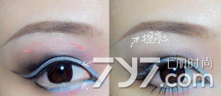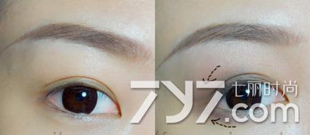 第二步:继续用深色眼影加深轮廓,加重双眼皮折痕,画出上扬眼线。用浓黑色眼线液笔填补内外眼线,眼头拉长出如图效果,下眼尾向下勾勒出一条轮廓,让眼睛看起来像鹿一样大而无辜。