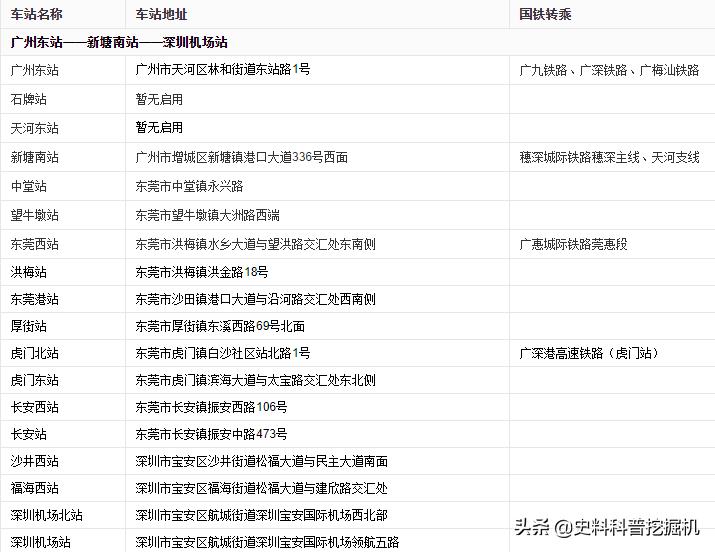 广州东站、新塘南站、中堂站、望牛墩站、东莞西站、洪梅站、东莞港站、厚街站、虎门北站、虎门东站、长安西站、长安站、沙井西站、福海西站、深圳机场北站和深圳机场站