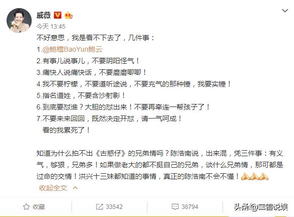 3月30日,戚薇的微博上喊话鲍云说:她有几件事看不惯,实在是看不下去了,说的第1件事就是说有事说事,不要阴阳怪气。第2件事说痛快人就要说痛快话,不要磨磨唧唧的。第3件事就说,指名道姓,不要含沙射影!等等从戚薇发出的这个微博可以看的出,戚哥的性子比较直,做事情从来不拖泥带水,有话直说。#戚薇怼鲍云#