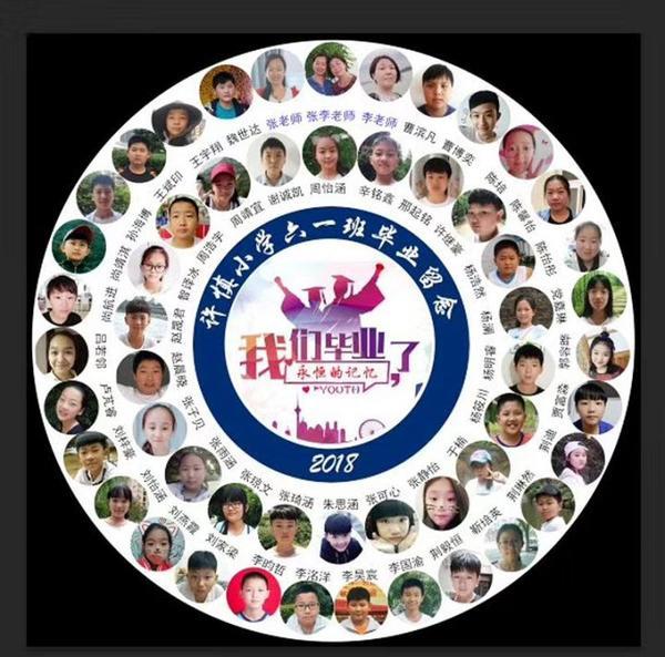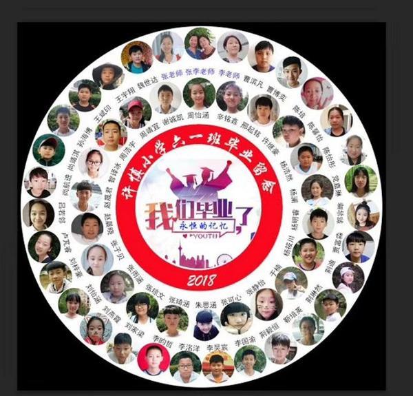 记者注意到,这两张毕业照为圆盘型,中间是“许慎小学六一班毕业留念、我们毕业了,永恒的记忆”的文字,两圈分别是50名孩子和2名老师头像照片,很与众不同。6月11日下午,记者联系到了“庭前花开”。她告诉记者,她的儿子是许慎小学六一班的学生,今年毕业离校。