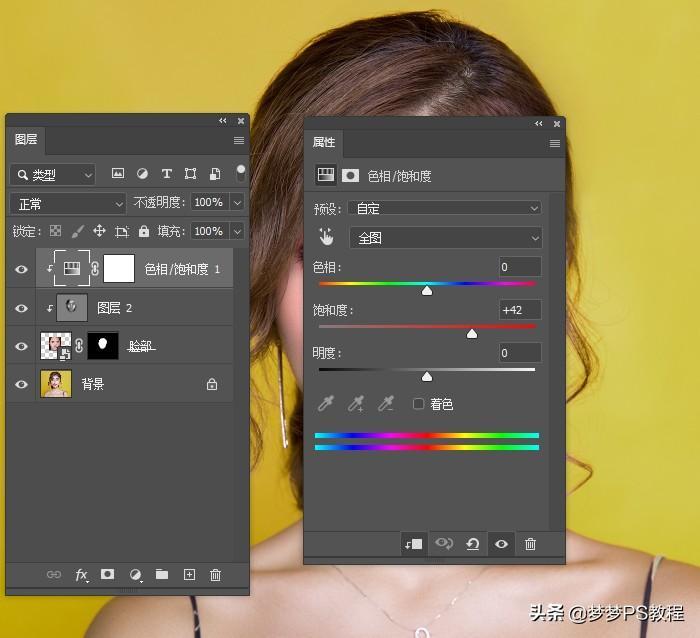 7.最后可以将口红颜色调一调,选择色相饱和度将饱和增加一些,然后将该图层的蒙版调为黑色,再通过白色画笔单独涂抹嘴唇的地方即可。
