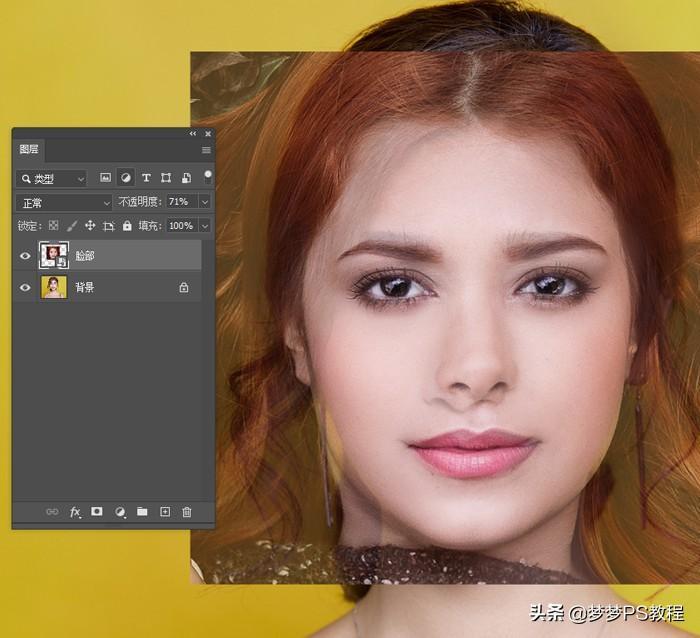3.将这个脸部图层的透明度降低一些,然后ctrl+t缩小调整到贴合素材1的脸部位置之后再将透明度调回100%。