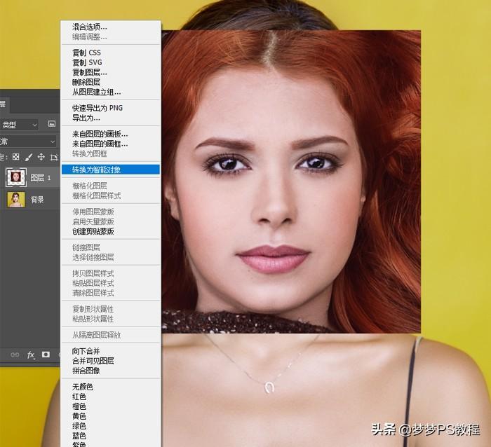 2.用移动工具将刚刚选区脸拖到素材1上方,再转图层为智能对象。
