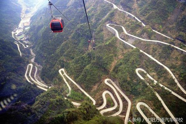 张家界天门山盘山公路有"通天大道"之称,盘山公路全长10.77公里,海拔从200米急剧提升到1300米,大道两侧绝壁千仞,空谷幽深,共计99个弯,180度急弯此消彼长,似玉带环绕,弯弯紧连,层层迭起,直冲云霄,被誉为“天下第一公路奇观”。