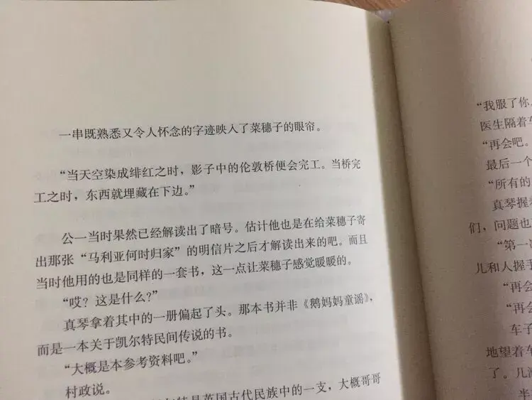 经过二人缜密侦查和推理,期间也是得到了上条(邀请原公一的私家侦探)、大厨、经理和酒店司机高濑(最后从书中可推断是川崎私生子?)的或明或暗的协助,得出鹅妈妈童谣咒语中的谜底所指示位置:晚霞下的伦敦桥下。