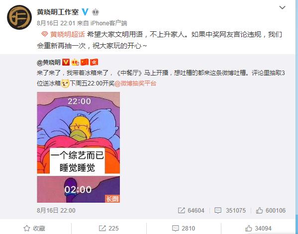 人家黄晓明倒并非玻璃心,先是回应称“至少摆脱了油腻嘛”。8月16日晚,他甚至发微博表示,愿意以3台冰箱作为奖品,鼓励网友吐槽他在《中餐厅》中的表现,只“希望大家文明用语,不上升家人”。这种面对批评的态度,至少是诚恳和宽容的,比某些明星和网友互怼强得多吧?