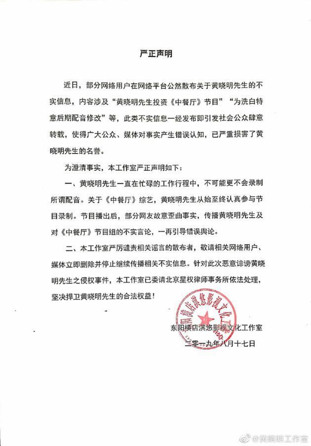 8月17日下午,针对“黄晓明投资《中餐厅》节目,为洗白特意后期配音修改”的不实传闻,黄晓明工作室发严正声明辟谣,称“黄晓明先生一直在忙碌的工作行程中,不可能更不会录制所谓配音”,关于《中餐厅》综艺,声明表示“黄晓明先生从始至终认真参与节目录制”。