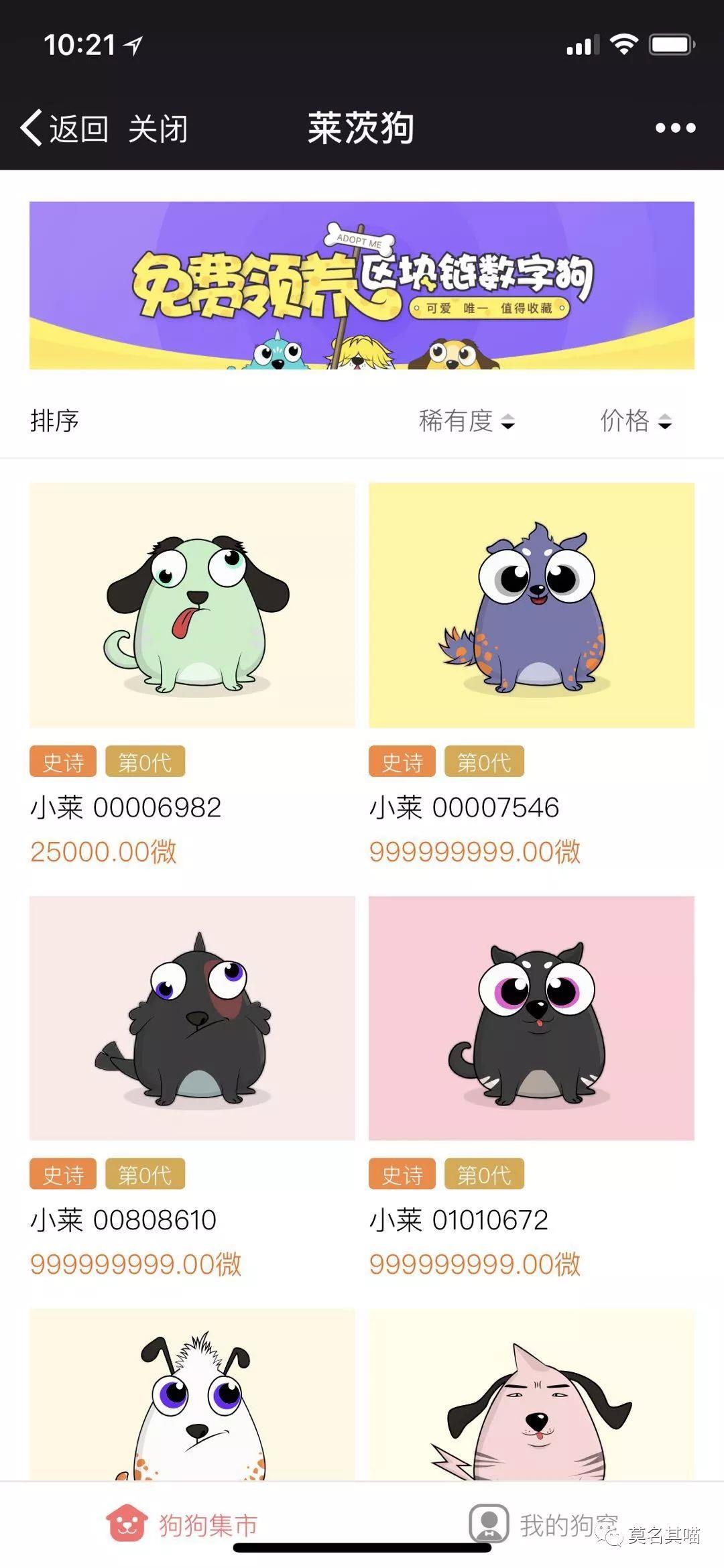 去狗市逛逛,目前别人卖的最高的是史诗,四个稀有属性。风格也都模仿《crypto kitties》,长得并不好看,不过谁在乎呢?