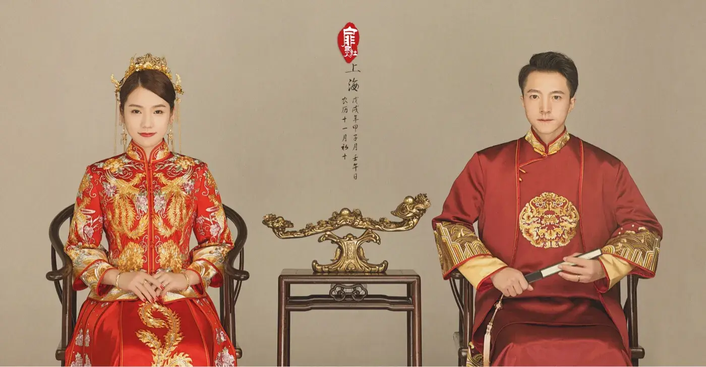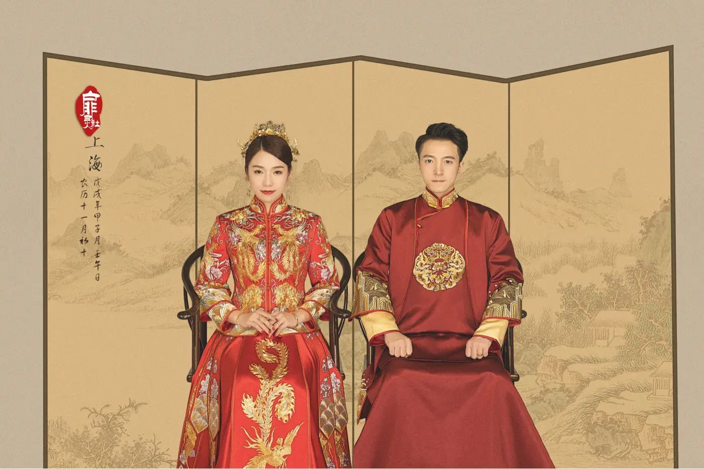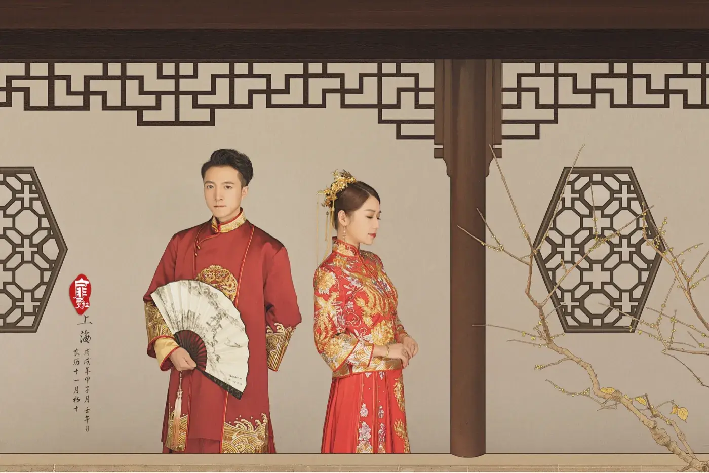 工笔画风格的婚纱照一般都是室内完成,场景中一般配有中国元素的家具跟摆设,也有后期靠中国元素的素材或者绘制图案来进行修图。不过整体上面是偏向于复古风格的婚纱照。