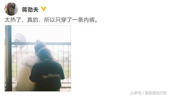 大晚上,蒋劲夫发了一条微博,好像是公开恋情,他写道:太热了,真的,所以只穿了一条内裤。评论里粉丝沸腾了,纷纷求证是公开恋情吗?还用求证吗,这个画面就是甜甜的情侣照啊,那么女朋友是谁?