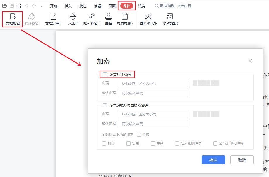 2.点击右上方的【保护】选项卡,选择【文档加密】,之后就可以看到一个设置窗口,我们取消勾选【设置打开密码】,接下来点击【确认】即可。