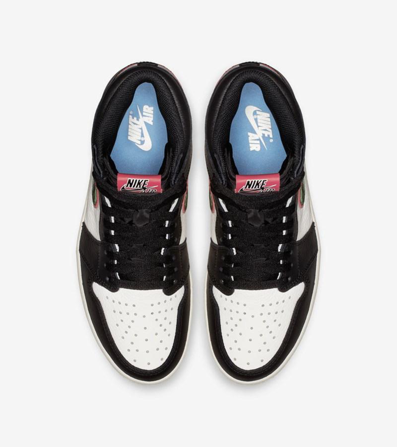 鞋面采用的荔枝皮打造,配色方案以最经典的黑白为主调,鞋帮辅以红色的飞翼 Logo 点缀。