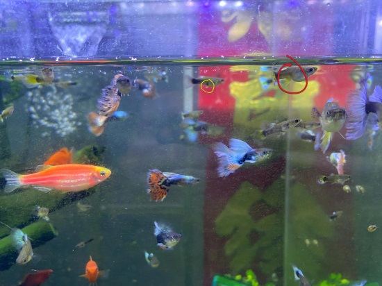 一个月左右的孔雀鱼,红圈是公,肚子没有黑色,也暂时还没有生殖器。黄圈是母,肚子有黑色。