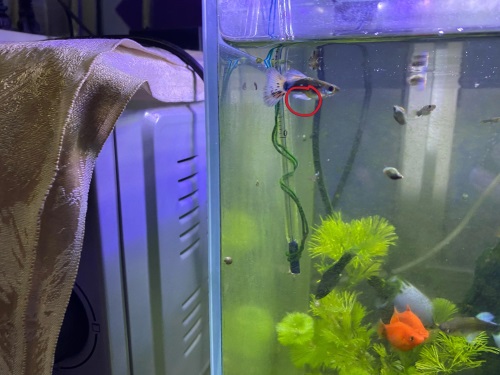 母孔雀鱼,长大后,没有尖的生殖器,颜色也比较暗淡,但是肚子后面是黑色的,非常明显,快到生小鱼时,肚子会很大,可以见下图,红圈的地方。