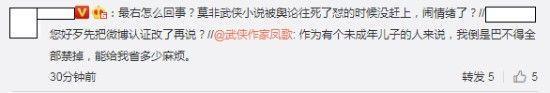 微博认证为“前《倩女幽魂2》剧情创意总监凤歌,代表作《昆仑》《沧海》等”的武侠小说作家在微博上说:“作为有个未成年儿子的人来说,我倒是巴不得全部禁掉,能给我省多少麻烦。”这一表述引起了许多网友的不满。而且武侠小说过去也曾遭遇和今天游戏类似的对待,武侠现在被接受了,武侠作家却希望“禁掉游戏”,这让网友感到愤怒。下图源自游民星空。