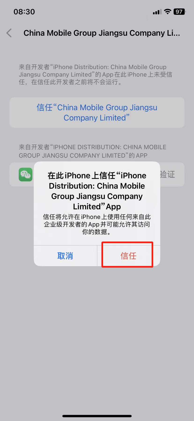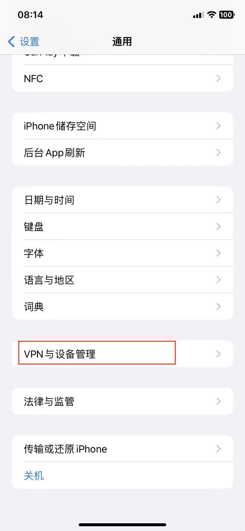 三:打开手机的“设置”,选择“通用”,接着再选择“VPN与设备管理”;在企业级中找到对应的文件,选择信任,就可以使用了。