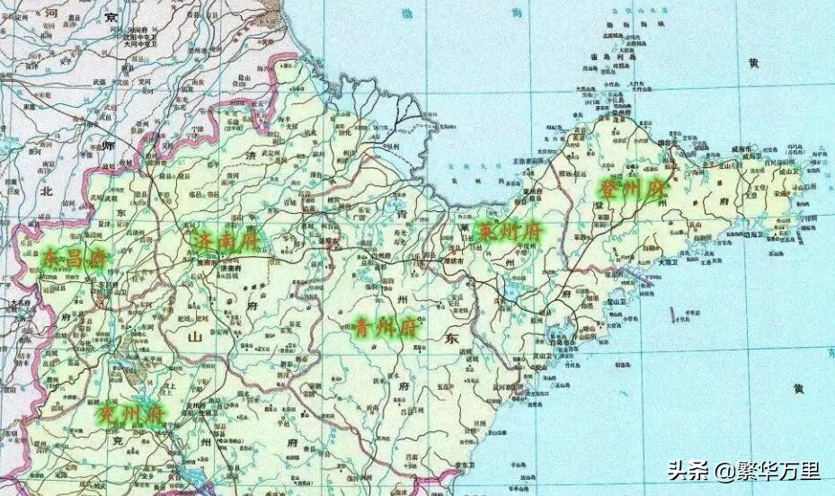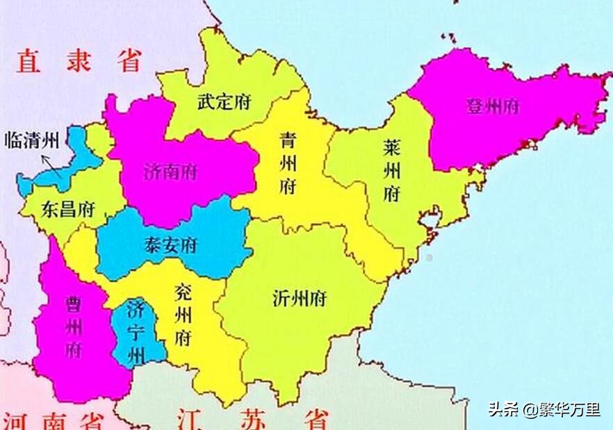 17世纪中期,清朝消灭了各地的农民起义军势力、南明各个政权,逐步确立了对全国的统治。根据自己的需要,调整了各省的区划,形成了18个省的区划格局。在清朝统治时期,山东省划分为10个府、3个直隶州,分别是:济南府、东昌府、泰安府、武定府、兖州府、沂州府、曹州府、莱州府、青州府、登州府、临清州、济宁州、胶州。