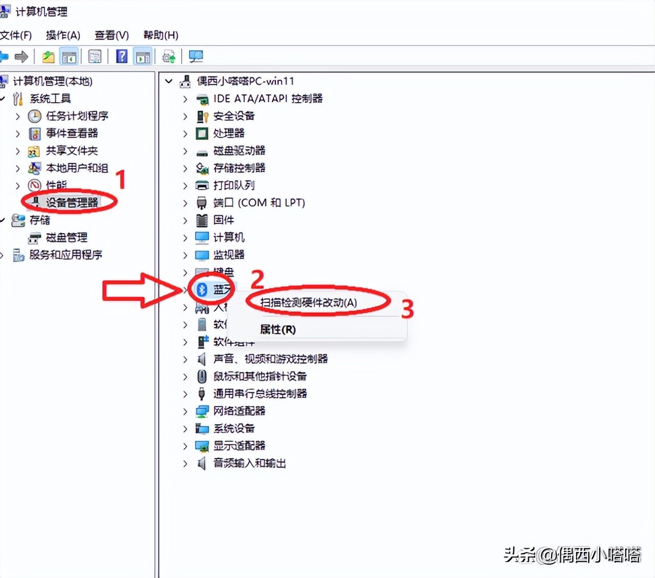 2、在打开的计算机管理窗口里,找到设备管理器(下图标号1),在右侧会找到蓝牙图标(下图标号2),在蓝牙图标上直接点击鼠标右键,会弹出小菜单,选择第一个“扫描检测硬件改动”(下图标号3)如下图所示: