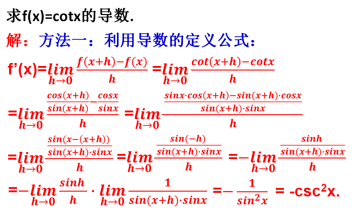在没有其它常用导数的支持下,求cotx的导函数,只能借用导数的定义公式。