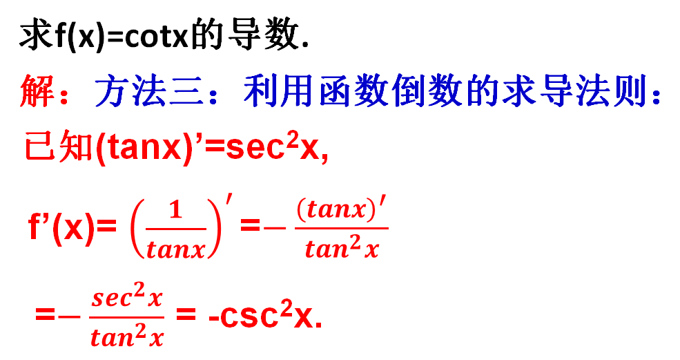 或者,我们也可以利用tanx的导数,根据函数的倒数求导法则来求cotx的导数。