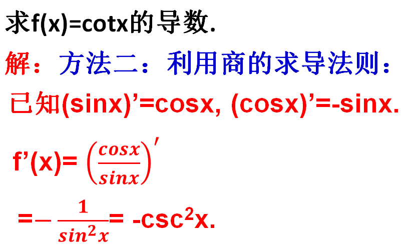 其实我们在求cotx的导数之前,在教学中,都是已经求得sinx和cosx的导数的,因此我们也可利用商的求导法则来求cotx的导数。