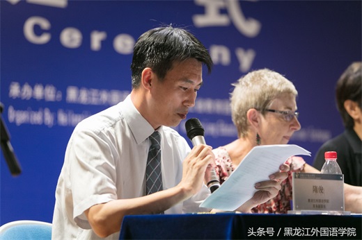 北美英语协会教学领队哈得逊-沙蓉女士,黑龙江省教育厅副厅长尹晓岚女士,黑龙江省教育厅国际交流中心副主任范志国先生,黑龙江省国际交流中心国家协会项目部部长赵敏毅先生,黑龙江外国语学院院长刘英女士、常务副院长隋俊先生出席参加仪式。会议由隋俊先生主持。