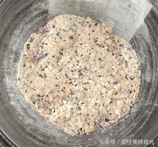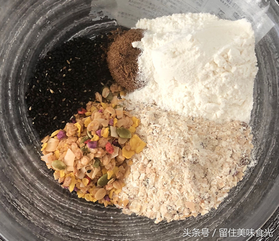1、将即食燕麦、谷谷脆、黑芝麻,面粉、盐、红糖混合均匀;