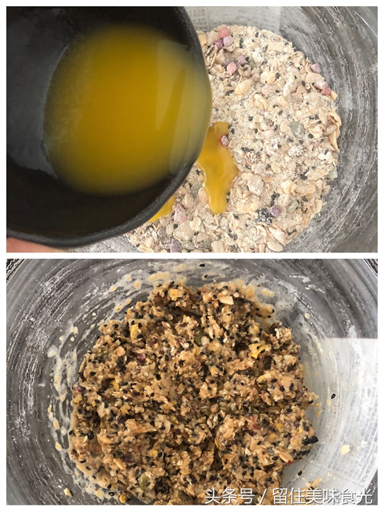 2、黄油融化后,倒进混合好的材料里,再加入30ml的水,搅匀,一定要注意比例哦,水和油不要太多,不然就成粥啦,燕麦之间抱团即可;