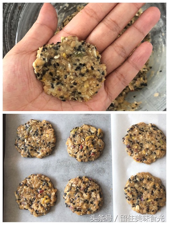 3、取一块混合好的湿性燕麦搓成小球,再按扁圆,厚度以5mm为宜哦,放在铺好油纸的烤盘上;