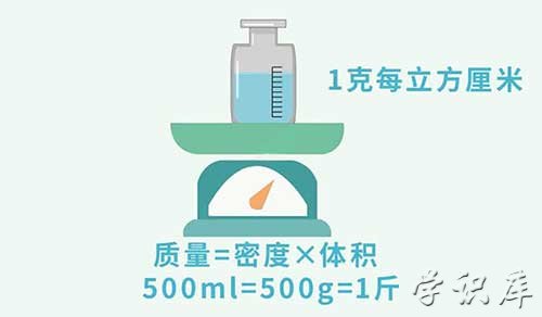 一般情况下,毫升是用来计量液体体积的单位,斤是用来计量物品重量的单位。两者并不是相同的计量单位,但根据相关质量公式,可以将通过体积和密度来推出质量,所以,此处500毫升是1斤,指的是500毫升水为一斤。而其他液体与水的密度不同,则不能适用换算公式。