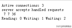 Active connections – 活跃的连接数量server accepts handled requests — 总共处理了7个连接 , 成功创建7次握手, 总共处理了36个请求。reading — 读取客户端的连接数。writing — 响应数据到客户端的数量。waiting — 开启 keep-alive 的情况下,这个值等于 active – (reading+writing), 意思就是 Nginx 已经处理完正在等候下一次请求指令的驻留连接。