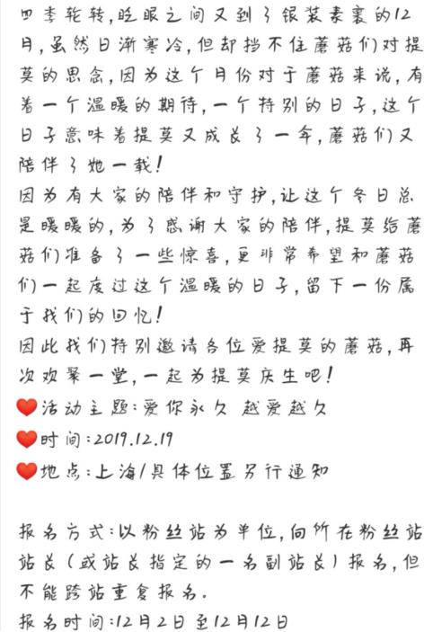 小蘑菇们这次还提前组织给提莫庆生的活动,提莫的粉丝后援会已经开始发布消息,接受全国各地粉丝的报名,希望能在十二月十九日能给提莫带来一个暖暖的惊喜。提莫在微博上也看到了后援会发布的这条消息,当时就被感动了,表示自己的小蘑菇是真的很暖心,果然自己宠的粉是真的对自己很好的。
