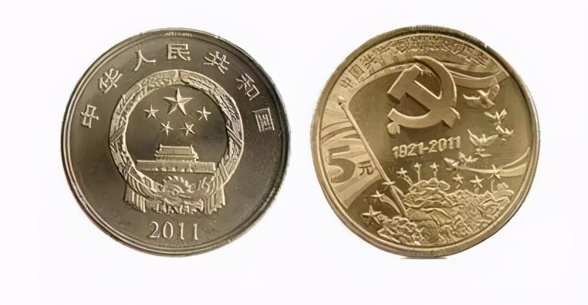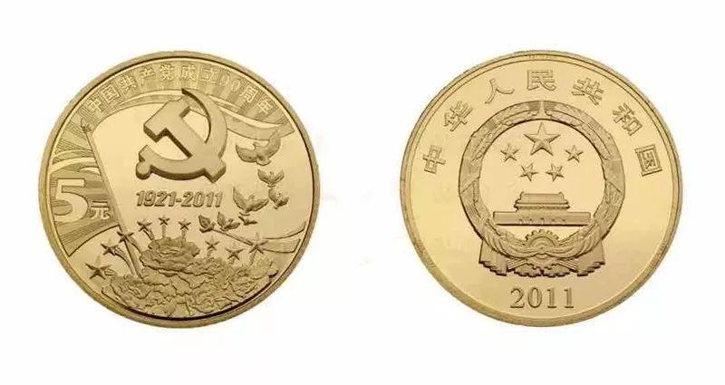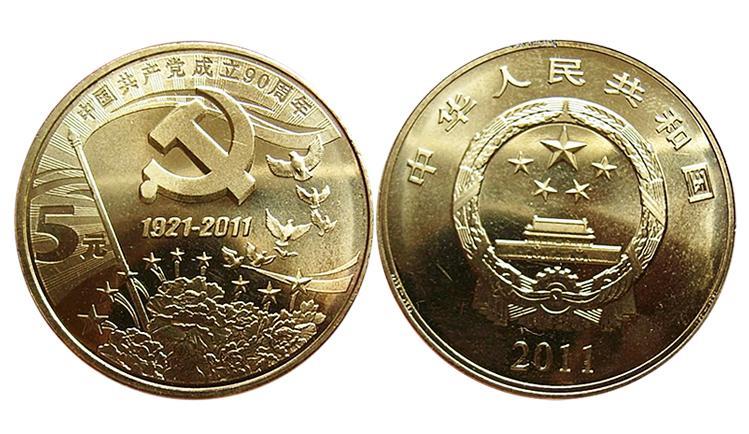 中国共产党成立90周年正面为国徽,内缘上方刊“中华人民共和国”国名,内缘下方刊“2011”年号;背面主景图案为中国共产党党徽、党旗及牡丹、和平鸽、五角星,党徽上方刊“中国共产党成立90周年”字样,下方刊“1921-2011”字样。内缘左侧刊“5元”面额数字。中国共产党成立90周年普通纪念币面额为5元,直径为30毫米,材质为黄铜合金,发行数量6000万枚。