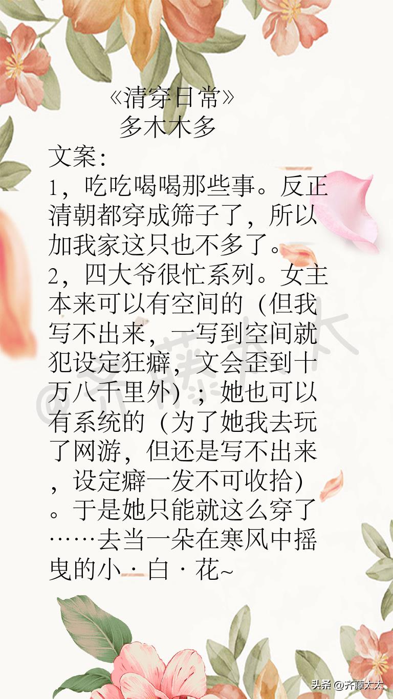 这一期算是追剧《卿卿日常》之后的观后感哈哈,这么多年小说看下来,讲实话要每一本都记住根本不可能,但是印象中每个类型的代表作还是记得几本的,《清穿日常》是我目前看过的最喜欢的清穿文,没有之一,这本书的文笔以及表达的女主的处事态度真的很绝,虽然是好几年前的文,但是现在看丝毫不觉得违和。现在看以前的霸总和女强文,有些文笔很雷的以前觉得很爽现在看来无比幼稚,但是文笔好的一直都是经典呀!