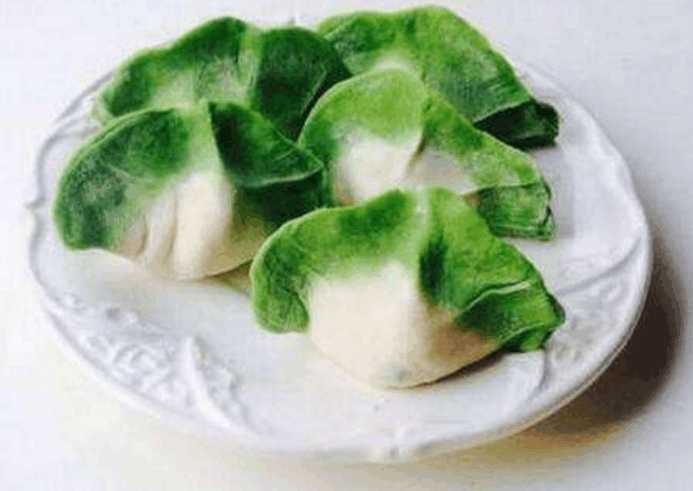 这个也要利用菠菜水和面,但是面和好之后,用擀面杖擀平,再在里面裹上一条清水和的面,这样做出来的饺子边缘是翠绿色的,中心是白色的,很想翡翠,所以就有这翡翠饺子这个好听的名字。颜值也可以算是所有饺子中最高的一种了!