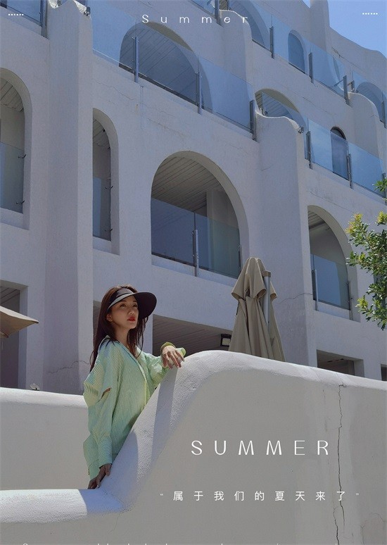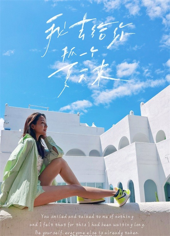 这张写真中,上面写有几个字:“飞去给你抓一个夏天来”。而蒋婷婷坐着护栏上,伸出大美腿,夏天的气息展现出来了。