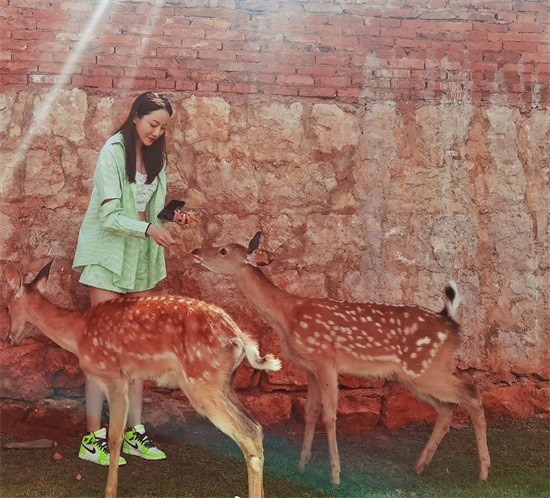 这张写真中,蒋婷婷与梅花鹿在阳光下用食物互相“沟通”。