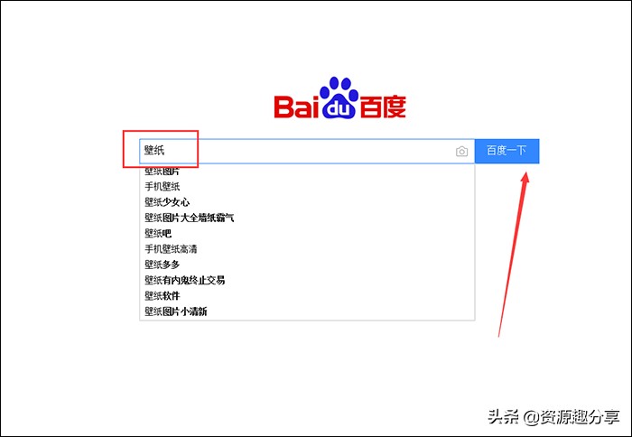 1、利用浏览器打开百度,直接在搜索栏中输入“壁纸”,然后点击搜索按钮就可以了。你也搜索菜单栏中壁纸的相关长尾词,在“壁纸”的搜索结果界面中,你可以点击“壁纸分来”选择你喜欢的壁纸类型,你也可以在“壁纸筛选”中设置壁纸的尺寸和色系。