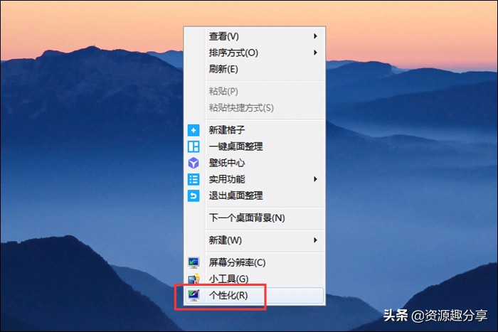 1、将光标移动到电脑中的任意空白位置,鼠标右击。然后点击菜单栏中的“个性化”。
