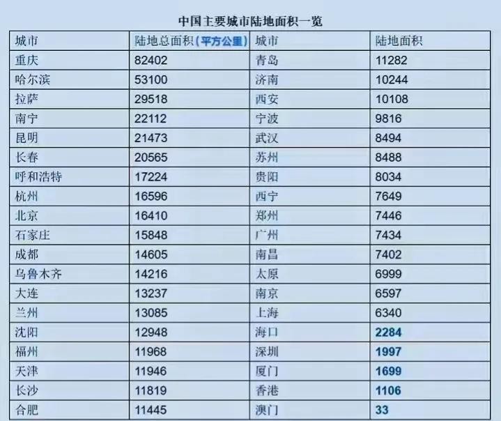 成都(包括三圈层、简阳等所有大成都范围) 1.46万平方公里,在50个直辖市、省会、计划单列市中,排名第11,比成都面积大的有昆明(2.14万)、杭州(1.65万)、北京(1.64万)。重庆总面积8.24万,是成都5.6倍。比成都小的天津、长沙、合肥、西安等,大致有07.-0.8个成都大。从这个排名看,成都大,但不算太大。