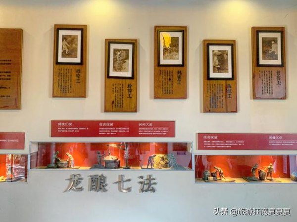 不仅如此,酒庄还是一个酒文化相关的博物馆,在这里看到不少有关酒文化的文献与资料,其中印象最深的是传统手工酿酒法-龙醸七法,在那个没有机器的年代,全部步骤都需要人力亲力亲为,各个工人之间相互分工,分成了摊晾工、粉碎工、封窖工、装瓶工、管窖工等等,再相互配合,历经“梅瓣岁红”、“续糟配粮”、“回马上瓯”等七个步骤才能得到一杯上乘的好酒,十分有趣。