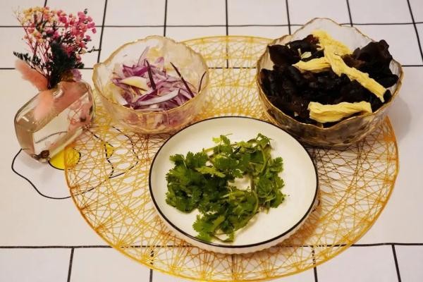 1. 腐竹、木耳泡发备用,香菜洗净、洋葱切丝备用
