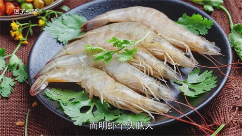 基围虾和明虾头部的须不一样,基围虾尾部比明虾看起来长,而且明虾虾壳的颜色比基围虾的深,偏向于深青色。基围虾的壳较硬,有明显的黄红色条纹,个子偏小,额头上无刺;而明虾个头肥大,额头上有刺,虾肉组织发硬。