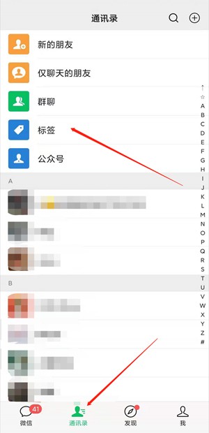 1、打开微信,进入“通讯录”界面,点击“标签”。