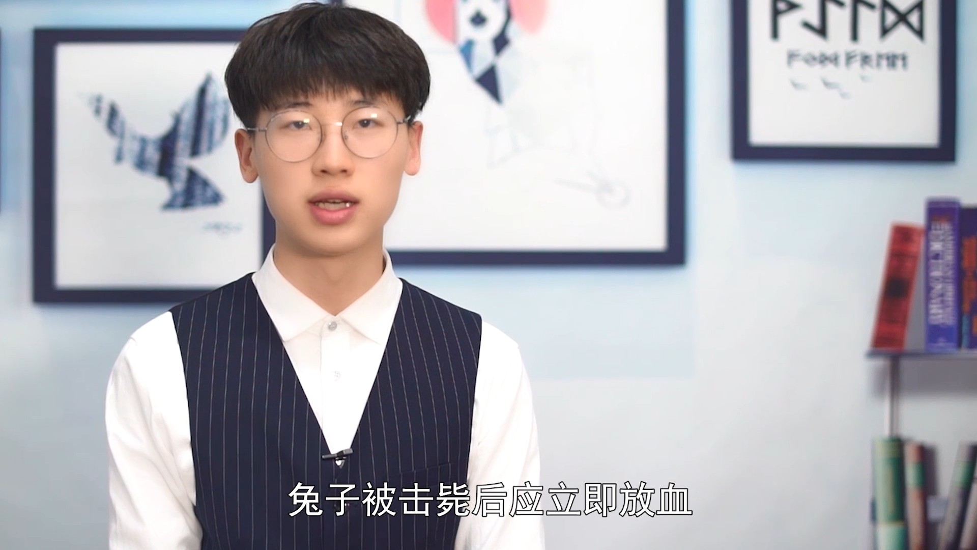 兔子被击毙后应立即放血。最好将兔体倒挂,用小刀切开颈动脉,充分放血,放血时间不少于二分钟。当放出的血呈淡粉红色时,肉质的保存时间最长。