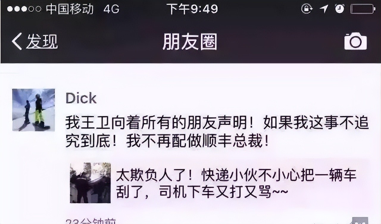 王卫看到后第一时间在朋友圈表态:“这事不追究到底,我不再配做顺丰总裁!”