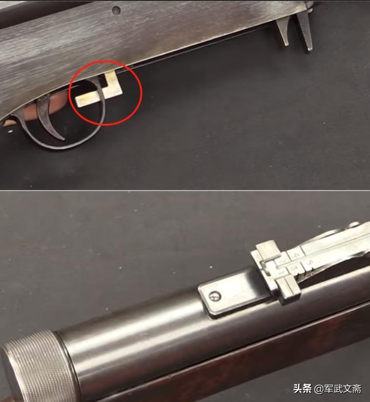 索米冲锋枪是可以半自动和全自动射击的,其快慢机就在扳机护环那里,可以调节半自动和全自动,也可以使枪处于安全状态。其使用的也是卧式标尺,上面总共有五个档位,最远的距离是五百米,这个距离,作为一把冲锋枪,其实有点多余了,但是芬兰人关于冲锋枪的定位其实是替代机枪的。